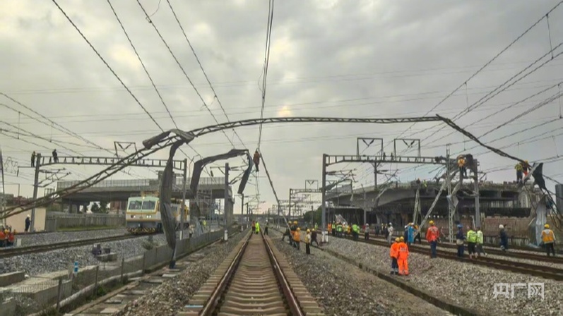 龍卷風將鐵路沿線一處彩鋼瓦棚頂連同鋼架梁一起吹至高鐵接觸網(wǎng)導致停電。