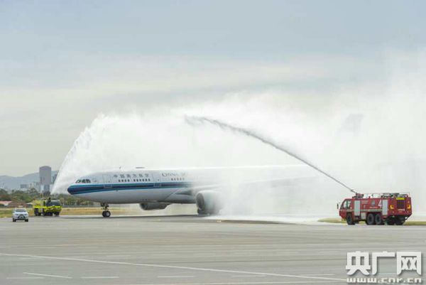 央廣網(wǎng)廣州12月13日消息(記者周羽)阿德萊德當(dāng)?shù)貢r間9點29分,南航CZ663首航航班平穩(wěn)降落在澳大利亞阿德萊德機場,當(dāng)?shù)貦C場以最高禮遇——過水門儀式向遠道而來的南航航班和機上乘客致以最熱烈的歡迎。南澳大利亞州總督黎孝文(Hon.Hieu Van Le)、南澳大利亞州州長魏杰(Hon Jay Weatherill)、澳大利亞旅游局局長歐肅文(John O'Sullivan)、中國駐阿德萊德總領(lǐng)事饒宏偉等人到場迎接首航航班。