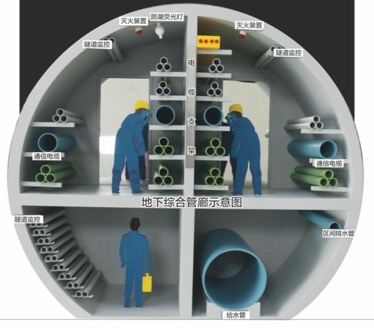 記者從三維動圖中看到,管廊外表是一條巨型圓管,它的內(nèi)徑5.4米,外徑6米,郭廣才透露,這次建造的管廊首次采用圓體空間,而不再是慣常用的矩形體,這主要是由于在老城區(qū)挖掘?qū)κ忻裆畛鲂袔順O大的干擾,采用盾構(gòu)法暗挖圓形隧道,可減少對城市的影響。而在管廊的內(nèi)部,安裝的橫豎兩甲板,平等把圓體空間劃分成上下左右四個扇形小房間,上半部兩個房間是電力艙,主要安裝電力管線;下半部分為綜合艙,水管線走在中間、通信管線在兩側(cè)通行。