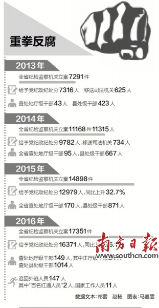 據(jù)南方日報報道:習(xí)近平總書記多次強(qiáng)調(diào)要以零容忍的態(tài)度懲治腐敗。黨的十八大以來,廣東以前所未有的力度推進(jìn)全面從嚴(yán)治黨工作。全省紀(jì)檢監(jiān)察機(jī)關(guān)共立案51194件,超過前10年立案數(shù)總和;查處地廳級干部470人,是前10年的1.6倍,位居全國前列。廣東以前所未有的力度推進(jìn)全面從嚴(yán)治黨工作,為推進(jìn)全面建成小康社會、全面深化改革、全面依法治國提供政治保證。