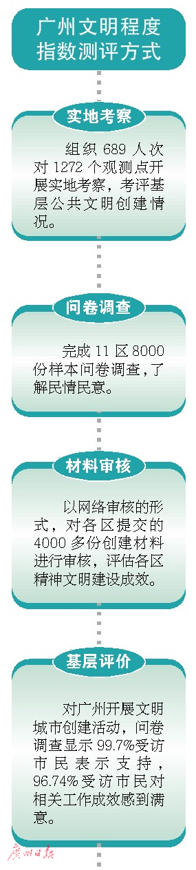 據(jù)大洋網(wǎng)報(bào)道,日前,廣州市文明辦發(fā)布了2016年度城市文明程度指數(shù)測評成績,顯示2016年廣州文明程度指數(shù)測評平均分為87.69分,市直部門專項(xiàng)測評平均分為90.99分,全市年度測評得分高于上一年,城市文明和市民素質(zhì)呈逐年提升之勢。