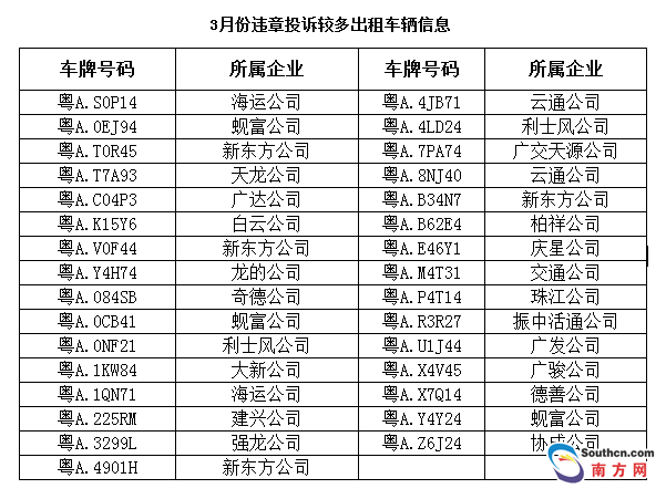 同時,廣州市交通部門還公布了3月份違章投訴較多的出租車輛信息。海運、云通、蜆富等公司的31輛出租車上了“黑榜”,詳見下表: