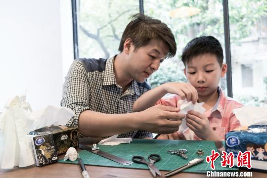 4日,廣州80后父子正在用紙巾制作著名科幻電影《星球大戰(zhàn)》人物模型。 華逸 攝