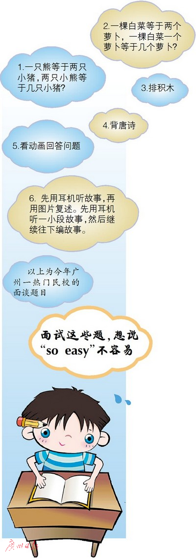 據(jù)廣州日報報道:日前,一則“上海幼升小面談,家長卻被考暈”的文章在朋友圈刷屏,上海一民辦小學(xué)在面談孩子的同時,把家長集中在幾個大教室里,讓家長們用手機(jī)做題。很多家長做不出來,擔(dān)心給娃拖了后腿,郁悶不已。這一消息的真假還有待驗證,不過,不少廣州家長卻“心有戚戚”,紛紛轉(zhuǎn)發(fā)。廣州各所民辦小學(xué)也將在近期陸續(xù)展開面談,“廣州的民辦學(xué)校也會考家長嗎?”不少家長擔(dān)心地問道,還打趣要不要緊急補(bǔ)補(bǔ)課。