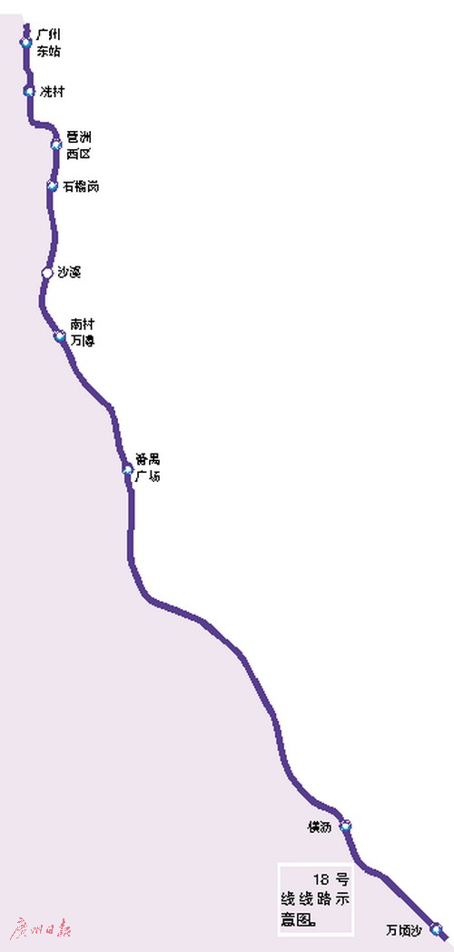 線路北起廣州東站、南至萬頃沙樞紐,總長62.5公里,設站9座,平均站間距超過7公里。為實現(xiàn)廣州市中心與南沙副中心30分鐘快速直達的時空目標,線路采用了最高時速160公里的系統(tǒng)制式,線路走向盡可能拉直及嚴格控制沿線車站設置數(shù)量。