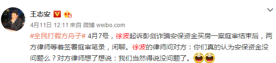 根據(jù)王志安4月11日發(fā)布的微博顯示,徐波起訴彭劍詐騙一案已經(jīng)進入庭審階段。該案有待進一步審理。