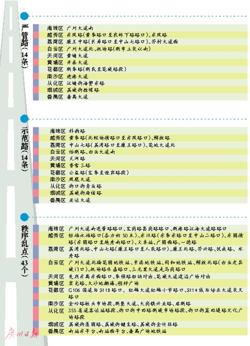 在首批公布的四個城市整治清單中,廣州公布了全市將集中打造14條“嚴管路”、14條“示范路”,攻堅整治43個“亂點”。