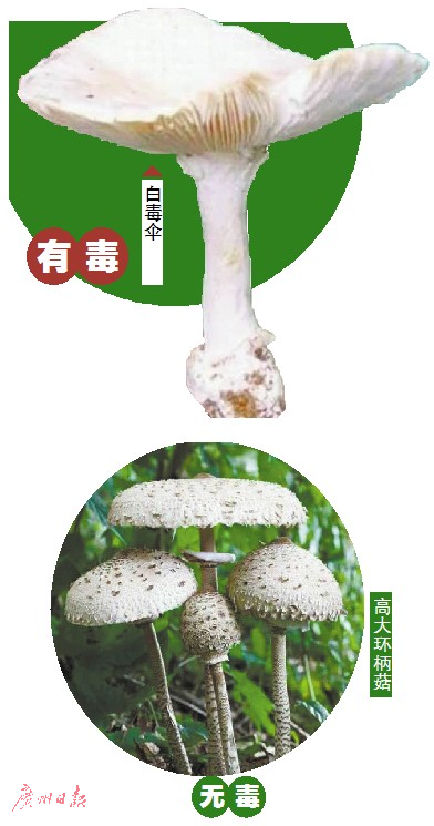 今年3月24日,來自重慶的黃伯在花都洪秀全水庫見山上長了一大片鮮嫩的白色野蘑菇,就采了大約1斤跟鴨蛋一起煮面條與妻子、女兒、女婿同時進(jìn)食。當(dāng)天4人出現(xiàn)惡心、嘔吐、腹痛腹瀉、乏力、尿黃、眼黃等癥狀,查出嚴(yán)重的肝損害。無獨有偶,同日在江門市打工的湖南民工姜女士在圭峰山采了七八兩鮮嫩的白色野蘑菇,炒肉吃后出現(xiàn)劇烈嘔吐、腹痛腹瀉,送醫(yī)后也查出嚴(yán)重肝損害。這兩批病人送到廣州市第十二人民醫(yī)院,幸虧及時救治都轉(zhuǎn)危為安。姜女士的1名老鄉(xiāng)同時也采食了圭峰山的野蘑菇,同樣出現(xiàn)嚴(yán)重中毒癥狀,在當(dāng)?shù)負(fù)尵葻o效死亡。經(jīng)廣東省微生物研究所鑒定,這兩起肇事蘑菇正是白毒傘。