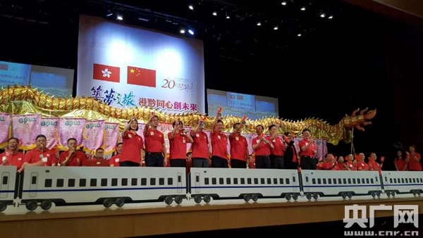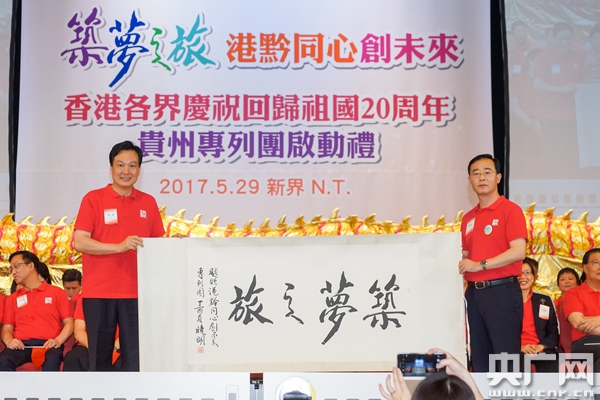 央廣網(wǎng)香港5月29日消息(記者周偉琪)5月29日下午,“筑夢(mèng)之旅港黔同心創(chuàng)未來(lái)──香港各界慶回歸20周年貴州專列團(tuán)”在新界鄉(xiāng)議局舉行啟動(dòng)禮。中央政府駐港聯(lián)絡(luò)辦副主任林武、香港特區(qū)政府財(cái)政司司長(zhǎng)陳茂波擔(dān)任主禮人,其它嘉賓、各界社團(tuán)領(lǐng)袖和義工超過(guò)900人出席。林武副主任為專列團(tuán)團(tuán)長(zhǎng)江達(dá)可頒授團(tuán)旗。