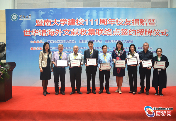 南方網(wǎng)訊 (全媒體記者/龔春輝 實(shí)習(xí)生/朱美仙 通訊員/蘇運(yùn)生) 11月18日,正值111周年校慶之際,暨南大學(xué)圖書(shū)館?世界華僑華人文獻(xiàn)館(以下簡(jiǎn)稱(chēng)“暨南大學(xué)世華館”)與海外16家暨南大學(xué)校友會(huì)舉行了簽約儀式,授牌成立16家“海外文獻(xiàn)收集聯(lián)絡(luò)點(diǎn)”。此項(xiàng)舉措旨在進(jìn)一步發(fā)動(dòng)海外各地暨南校友的力量,協(xié)助收集涉僑文獻(xiàn),并加強(qiáng)暨南大學(xué)涉僑學(xué)科的文獻(xiàn)保障力度。
