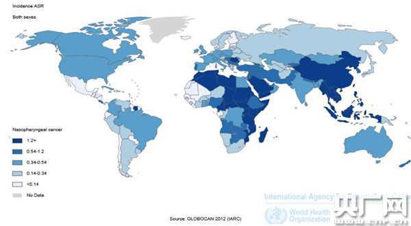 鼻咽癌發(fā)病率世界地圖顯示中國(guó)發(fā)病最高(數(shù)據(jù)來(lái)源www.iarc.fr)