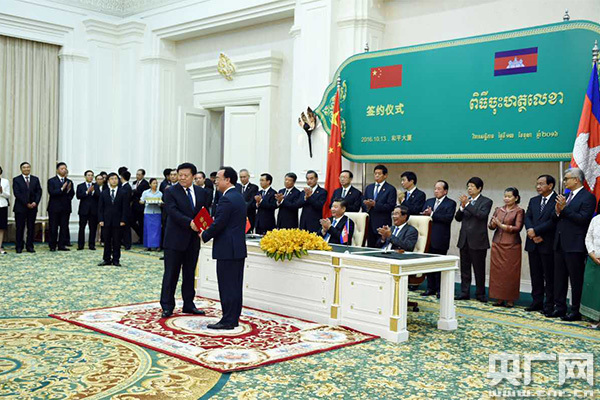 中國(guó)國(guó)家主席習(xí)近平和柬埔寨首相洪森共同見(jiàn)證南方電網(wǎng)公司與柬埔寨皇家集團(tuán)公司簽署投資合作備忘錄。
