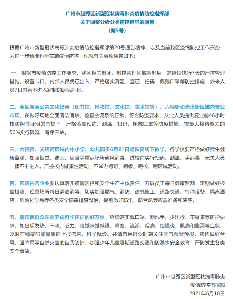 同時,六榕街、光塔街區(qū)域內(nèi)中小學、幼兒園于6月21日起恢復(fù)線下教學。