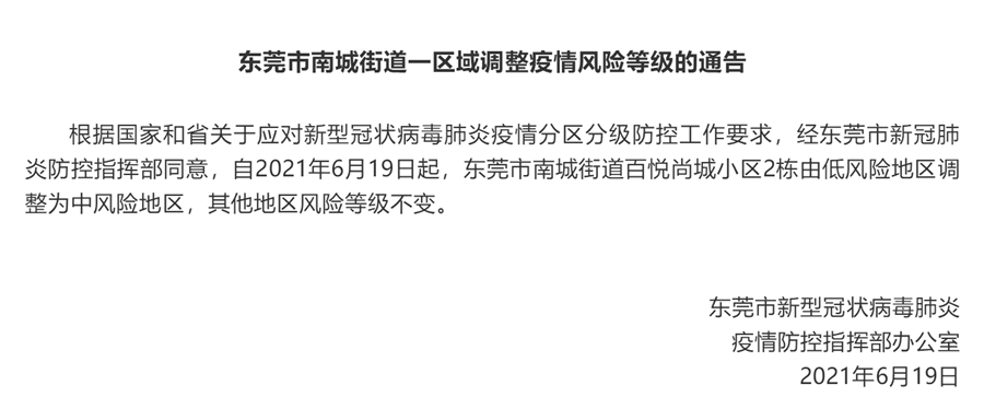 央廣網(wǎng)東莞6月19日消息(記者夏燕)6月19日,東莞市新型冠狀病毒肺炎疫情防控指揮部辦公室發(fā)布通告,自2021年6月19日起,東莞市南城街道百悅尚城小區(qū)2棟由低風險地區(qū)調(diào)整為中風險地區(qū),其他地區(qū)風險等級不變。