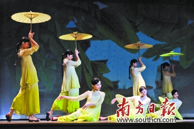 熱鬧、歡騰的舞蹈《獅舞嶺南》拉開了演出的序幕;歌曲《萬水千山總是情》《母親》勾起了僑胞濃濃的思鄉(xiāng)之情;舞蹈《桃色滿園》《雨打芭蕉》(見右圖)展現(xiàn)了溫婉、靈動的中國美;川劇變臉表演出神入化;雜技肩上芭蕾《蝶戀》將浪漫與驚險融為一體……精彩的演出不時引發(fā)掌聲和喝彩。