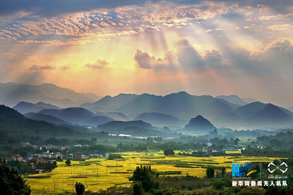 到了稻熟禾香的季節(jié),桂峰村里金燦燦一片,更是一幅美麗的山水畫。新華網(wǎng)發(fā)(巢金紅攝)
