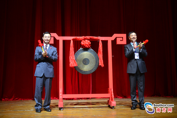 中國文聯(lián)副主席、戲劇家協(xié)會(huì)主席濮存昕和廣州市市長(zhǎng)溫國輝為開幕式鳴鑼