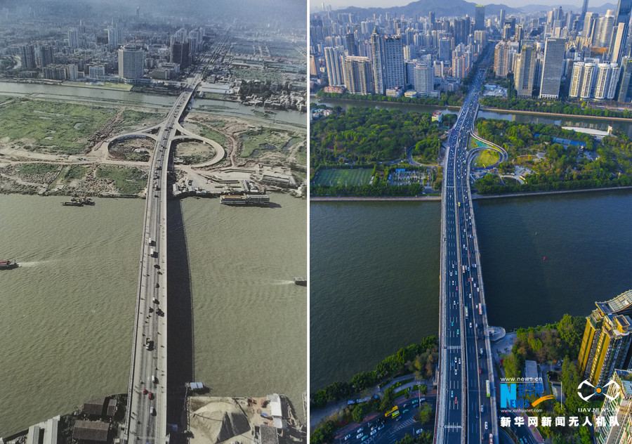 《廣州城建豐碑》一書里面收錄了幾張難得一見的航拍老照片。日前,新華網(wǎng)無人機在相同角度實拍對比,記錄了廣州城市交通及周邊環(huán)境的變遷。