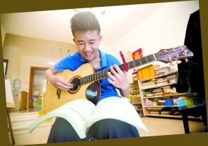 森友在家中練吉他,自彈自唱,十分享受。