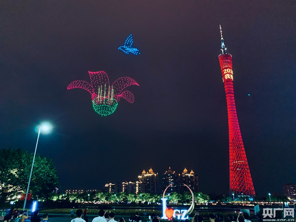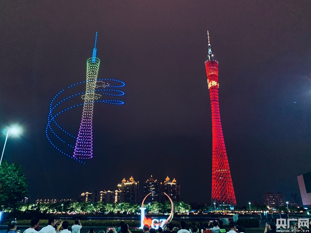 千架無人機致敬戰(zhàn)疫英雄,慶燈光秀刷亮廣州夜空。(央廣記者 周羽攝)