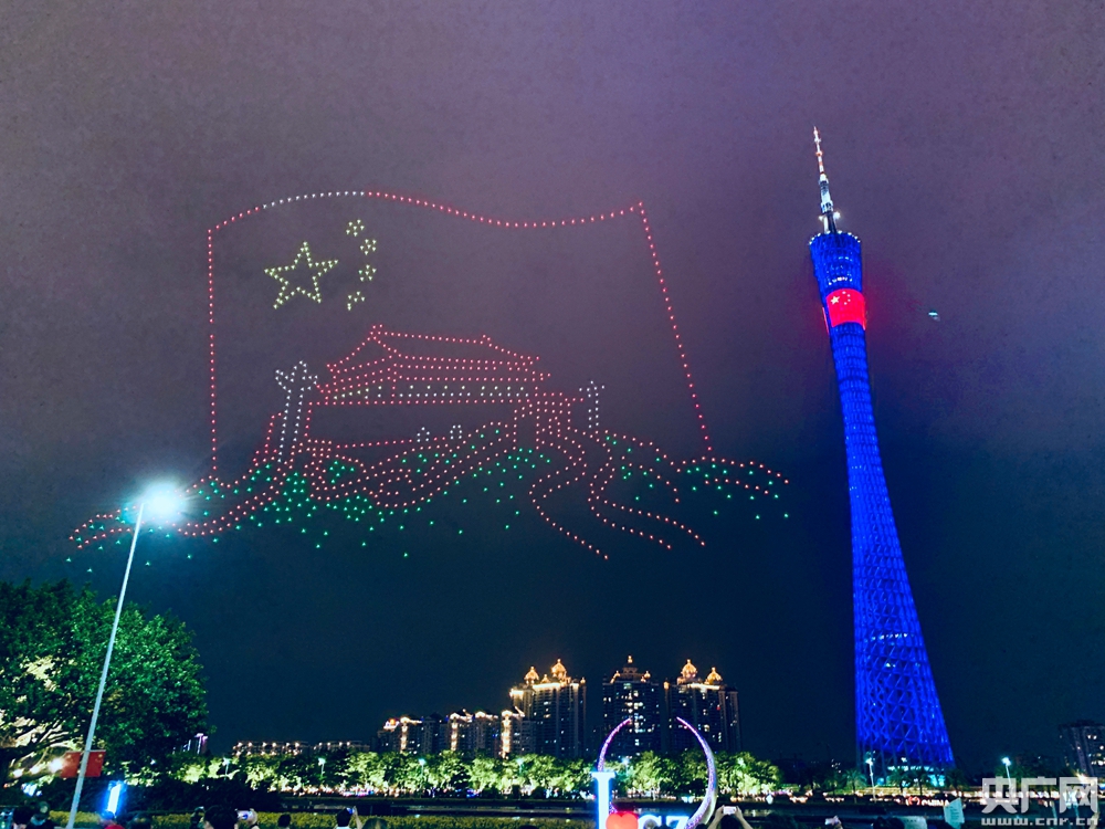 與無人機互相輝映的是在廣州塔上,不斷閃現(xiàn)“國慶逢佳節(jié),中秋共華誕”“2020 我更愛你中國”“山河無恙、家圓夢圓”“萬家團圓,祝福祖國”等標(biāo)語。讓人驚艷的是,廣州塔身上還出現(xiàn)了一面2000平方米的五星紅旗。