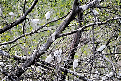 泛舟紅樹林,綠色的樹枝上站滿了鳥,呈現(xiàn)“黑白兩道”的景象:上層是“黑道”,下面是“白道”,游船靠近,“黑白兩道”也沒有受到驚嚇,呈現(xiàn)“一行白鷺上青天”美景,這與記者過去多次在濕地的觀感完全不同,難道“黑白兩道”要“開片”(打群架)?