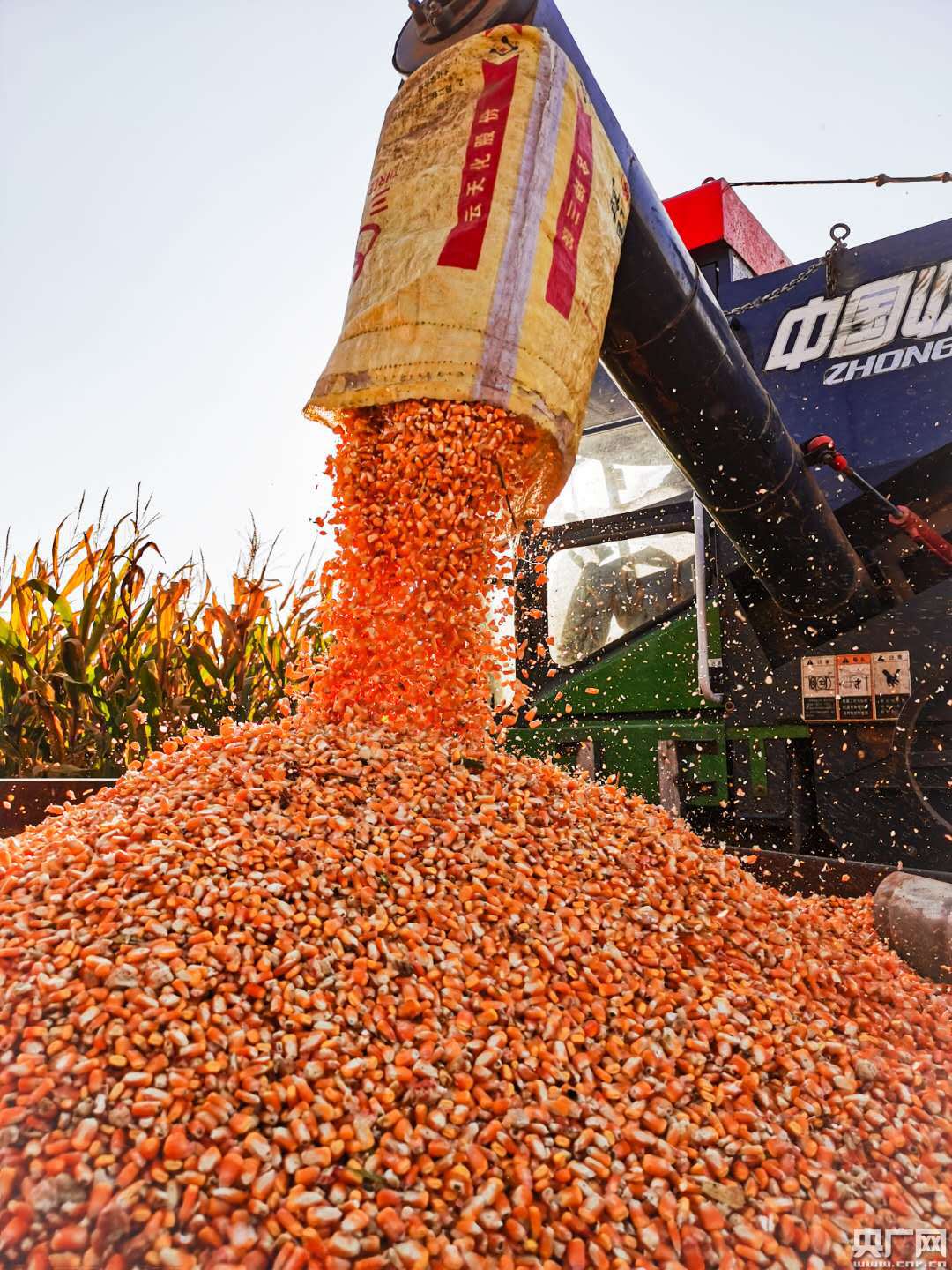 (圖為10月5日,在滑縣老店鎮(zhèn)堯頭村,玉米收割機將收割好的玉米顆粒進行歸倉。記者王紅霞 攝。)