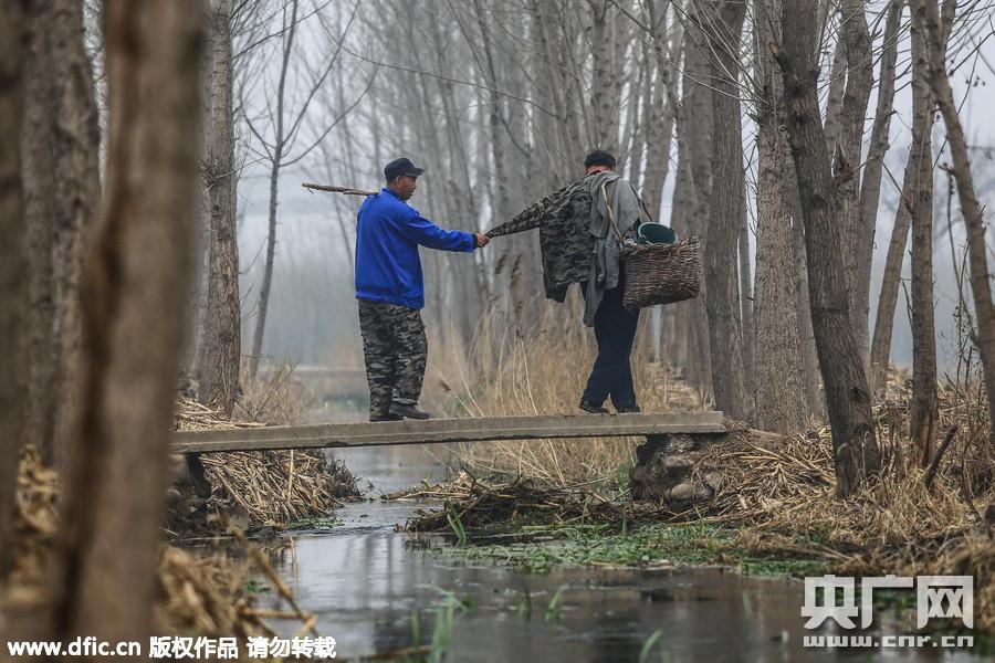 砍下樹枝便要盡快栽種。抵達(dá)荒灘需跨過一條寬約30米的小河,河道中水流湍急,圓石遍布,稍有不慎便會(huì)跌倒。賈文其要先涉水將樹枝扛于對(duì)岸,再回來背賈海霞過河。