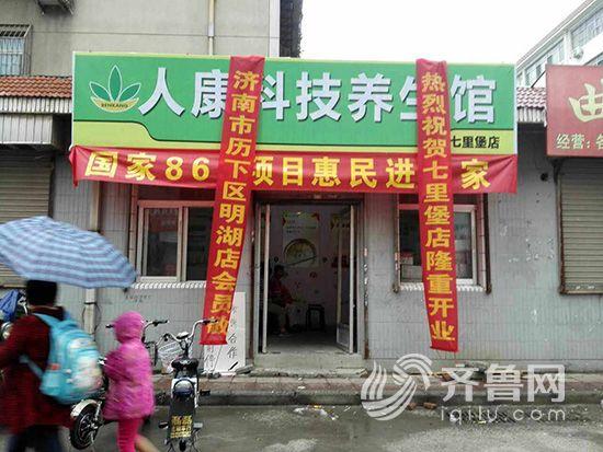 在簡單的面試后,記者被安排到了濟(jì)南歷城區(qū)南全福小區(qū)的店面上班。第二天早晨,記者來到了這家店面,這家店牌子上寫著人康科技養(yǎng)生館,還拉著條幅,上面寫著“國家863項(xiàng)目惠民進(jìn)萬家”。在店面門口有很多中老年人。