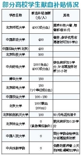 北青報記者隨機采訪的北京13所大學,有12所發(fā)放現(xiàn)金形式的營養(yǎng)補貼,金額從100到800元不等。除發(fā)放現(xiàn)金形式的營養(yǎng)補助外,各學校還有餐票、電話卡、校園卡充值、超市購物卡等其他補貼和獎勵。其中補貼最高的是北林的緊急獻血活動,金額達到了800元。僅次于北林,北京師范大學、中央財經(jīng)大學、中國石油大學(北京)、中國政法大學等校為獻血的學生最高補貼達到400元。
