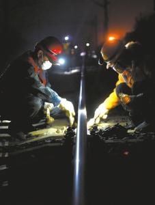 蘭江鵬低著頭,借著頭燈的亮光向前走著,兩眼盯鋼軌表面。突然,他蹲了下來(lái)!斑@里是焊縫處,得檢查一下!币慌,才參加工作半年的范雙權(quán)不住感嘆,“你眼睛太‘毒’了!