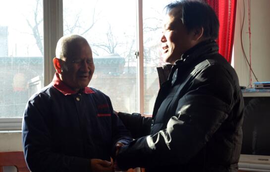 中華慈善總會秘書長邊志偉與貧困老人姜春茂親切交談(喬雪峰攝)