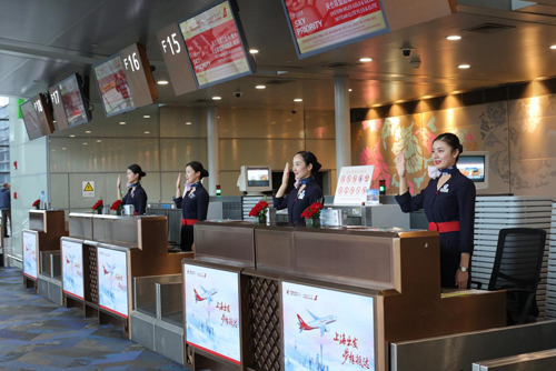 東航虹橋T2東航高端值機區(qū)區(qū)域經(jīng)理李新翼,今天一早就召集起她的組員開展班組晨會,每位組員臉上都神采奕奕。她說:“在虹橋機場高端值機區(qū)域F島,地面服務部除了開設頭等艙、白金卡、金卡、銀卡柜臺外還為本次進博會特別開設2個專屬柜臺。”,“用心關注,細心聆聽,服務先鋒我先行!薄嘟M成員正喊著她們的口號,走上崗位。