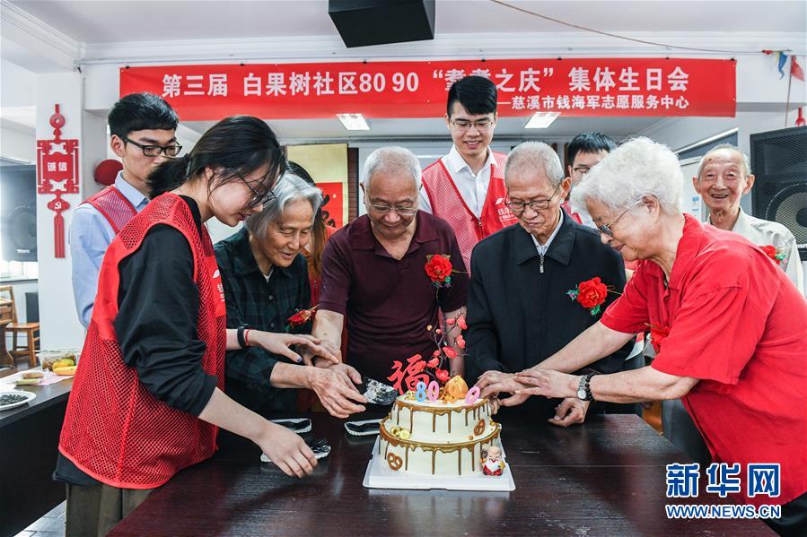 浙江省慈溪市錢海軍志愿服務(wù)中心的志愿者們來到慈溪市白果樹社區(qū),為該社區(qū)80歲以上的老人們舉辦集體生日會。志愿者為老人們準(zhǔn)備了歌舞節(jié)目表演、生日蛋糕和長壽面,在歡樂的氣氛中迎接即將到來的國慶節(jié)和重陽節(jié)。