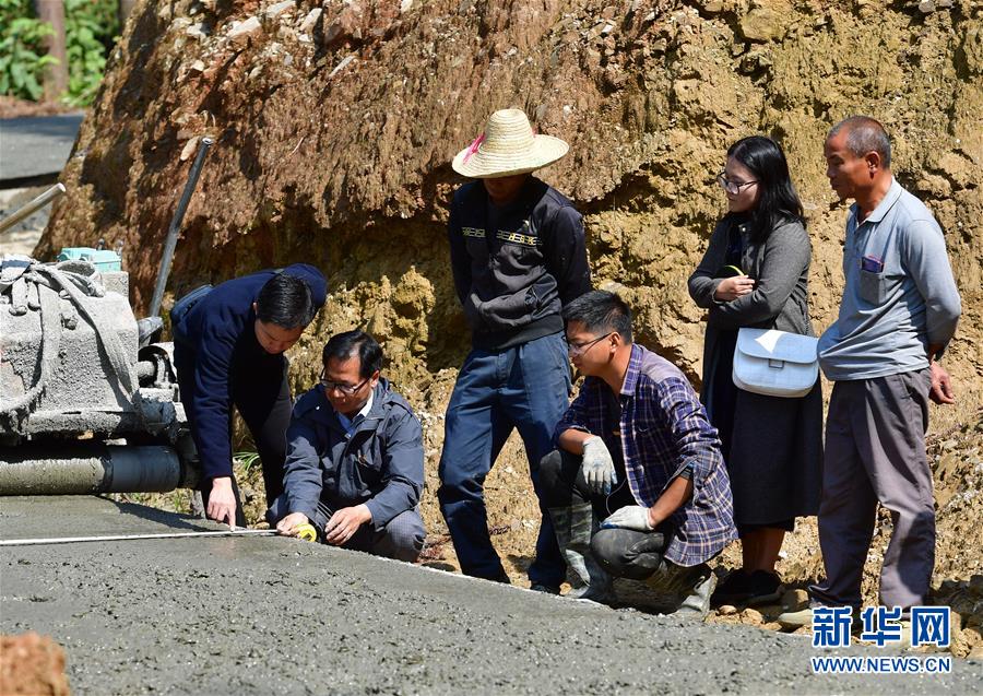 在廣西柳州市融水苗族自治縣良寨鄉(xiāng)培洞村,紀(jì)檢監(jiān)察干部(左二)在檢查扶貧道路施工情況(11月5日攝)。