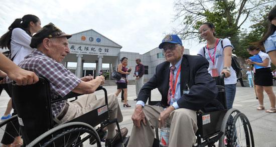 9月5日,二戰(zhàn)美國陸軍14航空大隊飛行員大衛(wèi)·湯普森(前左)和飛虎隊隊員保羅·克勞福德(前右)在芷江飛虎隊紀念館前交談。當日,參加第五屆中國芷江·國際和平文化節(jié)的部分美國飛虎隊老兵與家屬代表來到湖南芷江,參觀反映飛虎隊援華抗戰(zhàn)的專題性紀念館——飛虎隊紀念館。 新華社記者 龍弘濤/攝