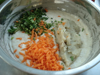 把紅薯泥,胡蘿卜末,香菜末都放入發(fā)面糊里。