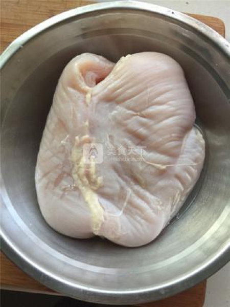 1、雞脯肉一塊,用水浸泡出血水,中間換兩次水