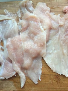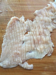 3、用刀背切斷雞脯肉的纖維,逆著切