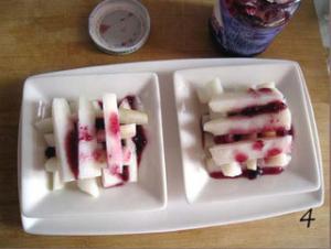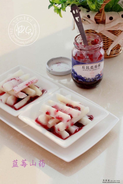 4、藍(lán)莓醬稍加些水稀釋勺在山藥條上即可食用。
