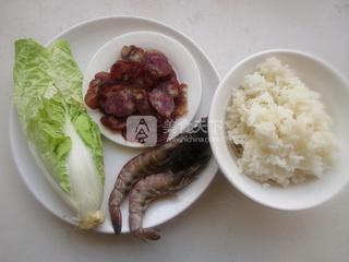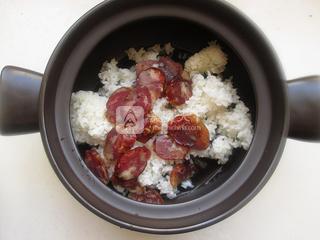 2、將臘腸和米飯加入水。