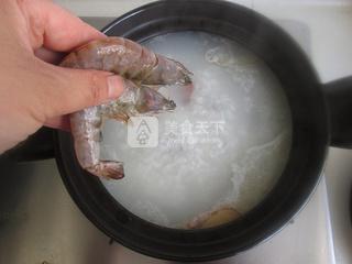 4、直至粥的湯汁粘稠,加入蝦。