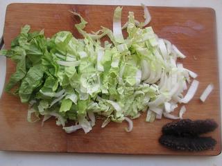 5、青菜菜芯提前洗凈切成絲,海參也切成小段。