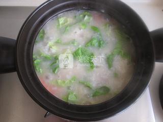 6、當(dāng)粥煮至自已喜歡的程度,加入青菜攪拌均勻煮沸。