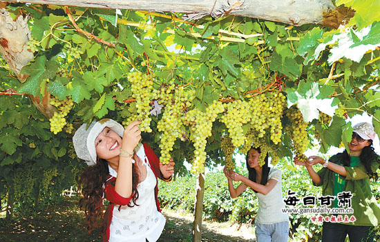 央廣網(wǎng)蘭州9月6日消息 8月31日,幾位游客在敦煌市陽關(guān)鎮(zhèn)種植園體驗(yàn)采摘葡萄。陽關(guān)鎮(zhèn)優(yōu)化葡萄產(chǎn)業(yè)結(jié)構(gòu),以設(shè)施有機(jī)葡萄種植業(yè)為主、以鄉(xiāng)村休閑觀光旅游為補(bǔ)充,促進(jìn)農(nóng)民增收。 本報(bào)記者 盛學(xué) 卿