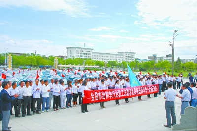 金昌市總工會(huì)連續(xù)四年開展了出租車行業(yè)職工志愿者義務(wù)接送高考學(xué)子活動(dòng)。圖為2012年活動(dòng)啟動(dòng)儀式現(xiàn)場(chǎng)。