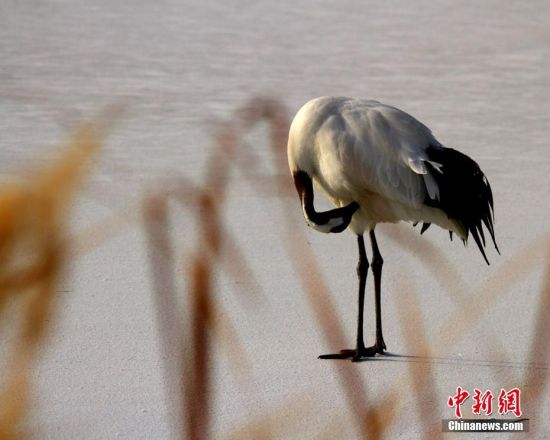 甘肅戈壁濕地丹頂鶴雪地“秀”身姿