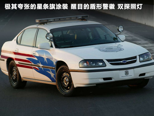 美國(guó)警車最大的特點(diǎn)是涂裝豐富,每個(gè)州都有自己的一套涂裝,基本上大同小異,而且盾形警徽可以辨識(shí)警車的歸屬地區(qū)。高強(qiáng)度的前碰撞裝置在美國(guó)俗稱Pushing Bar 就是撞擊用的鋼條。而且警燈的顏色也各有區(qū)別有的是藍(lán)色LED頻閃,有的是紅色燈泡。