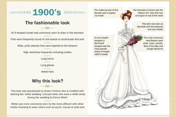 縱觀歷史,從上個(gè)世紀(jì)開(kāi)始,幾乎每十年就會(huì)有一個(gè)盛行的婚紗流行趨勢(shì),無(wú)論是各路名人、皇室,還是上流社會(huì)的婚禮,都會(huì)順著當(dāng)季的流行趨勢(shì)來(lái)選擇禮服,下面讓我們盤(pán)點(diǎn)一下自1900年起,婚紗的整體流行趨勢(shì)。