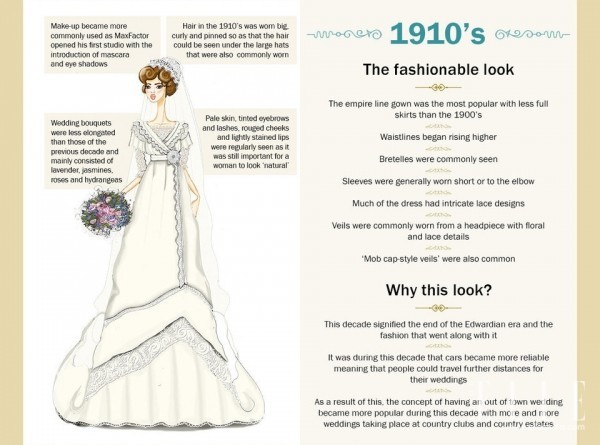 1910年代,婚紗的腰線(xiàn)變高了很多,肩部變得開(kāi)放起來(lái),露出精致的鎖骨,袖子也變短了,只到手肘部分。而在設(shè)計(jì)方面,加入了很多蕾絲的元素,對(duì)于頭紗,更加流行出租車(chē)司機(jī)式的風(fēng)格。